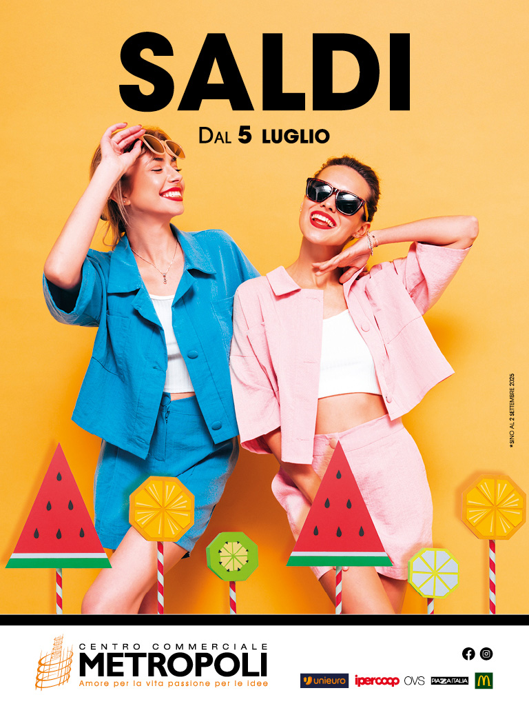 A partire da SABATO 5 LUGLIO 2025, il Centro Commerciale Metropoli ti dà appuntamento con i SALDI ESTIVI, un momento perfetto per rinnovare il guardaroba, scoprire le ultime tendenze e concederti qualche sfizio… risparmiando!